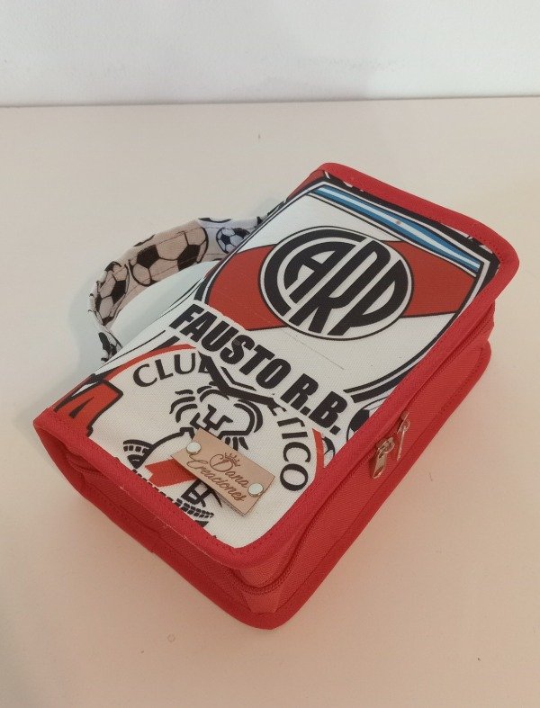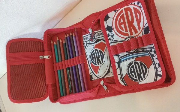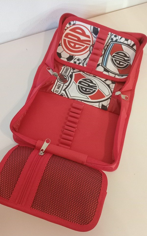 Dos solapas con bolsillos de red con cierre de un lado y elasticos para lápices del otro.